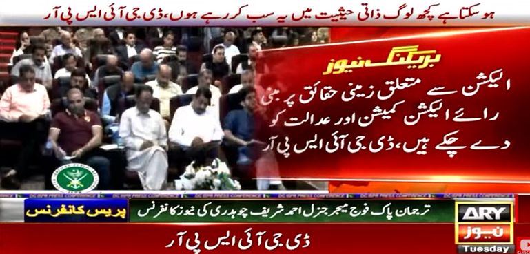 ڈی جی آئی ایس پی آر میجر جنرل احمد شریف نے کہا ہے کہ انتخابات سے متعلق زمینی حقائق پر مبنی رائے الیکشن کمیشن اور عدالت کو دے چکے ہیں۔