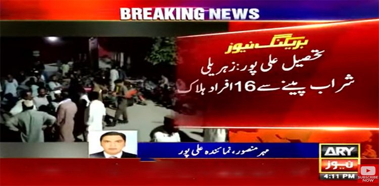 مظفر گڑھ کی تحصیل علی پور میں زہریلی شراب پینے سے ہلاکتوں کا سلسلہ نہ تھم سکا، ہلاک افراد کی تعداد 16 تک جاپہنچی۔