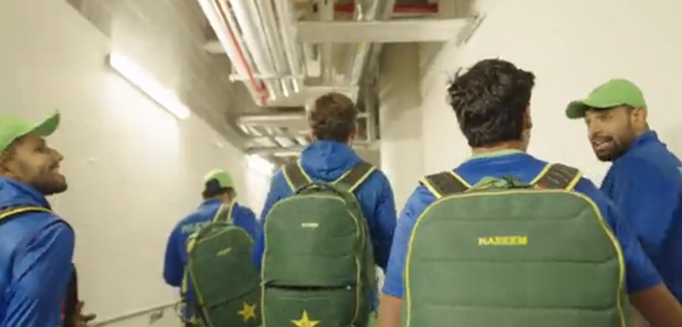 قومی کھلاڑی ہنستے مسکراتے، تالیاں بجاتے اور پرجوش انداز میں ملی نغمہ گاتے ہوئے ہوٹل پہنچتے ہیں، ان میں حارث رؤف، محمد حارث، نسیم شاہ اور شاہین آفریدی نمایاں نظر آ رہے ہیں۔