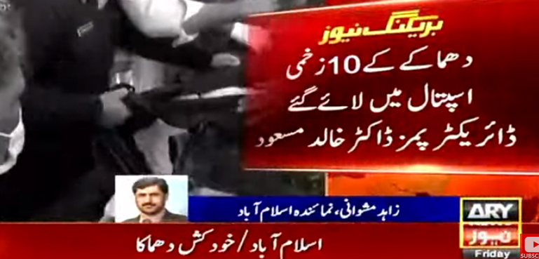 اے آر وائی نیوز کے مطابق وفاقی دارالحکومت میں خودکش دھماکے کے بعد ڈائریکٹر پمز اسپتال ڈاکٹر خالد مسعود نے میڈیا سے گفتگو کرتے ہوئے کہا ہے کہ خودکش دھماکے کے 10 زخمیوں کو اسپتال لایا گیا ہے۔