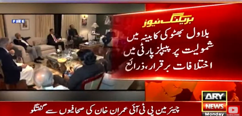 اے آر وائی نیوز کو اس حوالے سے ذرائع نے بتایا ہے کہ پی پی چیئرمین بلاول بھٹو کی کابینہ میں شمولیت پر پارٹی میں اختلافات برقرار رہیں اور پیپلز پارٹی کی سینئر قیادت بلاول بھٹو کے وزیر بننے کی مخالف ہے۔