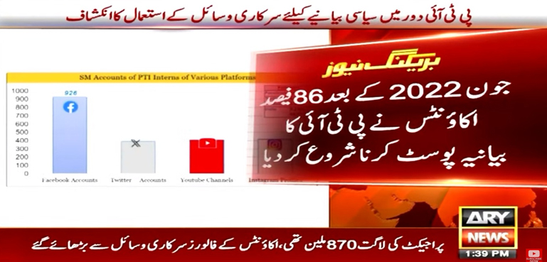 اے آر وائی نیوز کے مطابق پاکستان تحریک انصاف کے دور حکومت میں اپنے سیاسی بیانیے کیلیے سرکاری وسائل کے استعمال کا انکشاف ہوا ہے۔ ان سرکاری وسائل سے پی ٹی آئی قیادت کی تشہیر اور مخالفین کی کردار کشی کی گئی۔