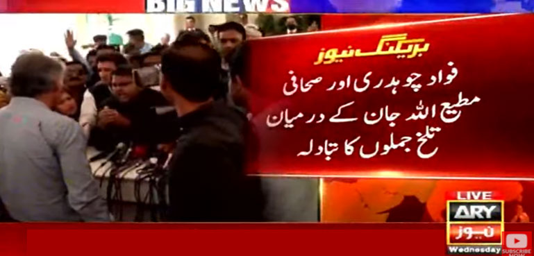 فواد چوہدری کی میڈیا سے گفتگو کے دوران بدنظمی ہوئی صحافی مطیع اللہ جان اور اور پی ٹی آئی رہنما کے درمیان تلخ جملوں کا تبادلہ بھی ہوا۔