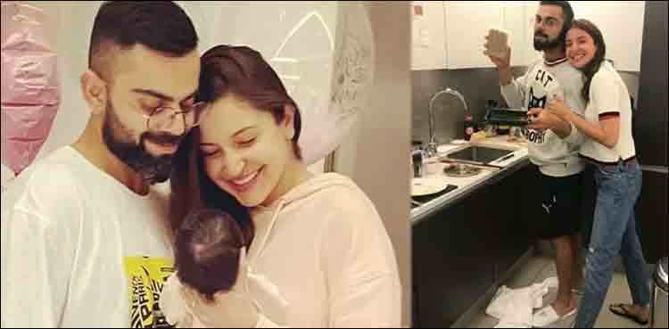 ادیتی نے ویرات اور انوشکا کی ایک تصویر شیئر کی جس میں ویرات کے ہاتھ میں برتن دھونے والا صابن ہے، جس سے بظاہر ایسا لگ رہا ہے جیسے ویرات کوہلی برتن دھو رہے ہیں۔