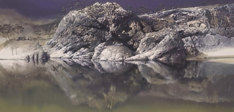 یہ تصویر ایک ایسے بصری وہم پر مبنی ہے جہاں ایک پہاڑ کی شکل پانی کے جسم میں جھلکتی ہے، جس سے عورت اور بچے کی ساخت بن جاتی ہے۔
