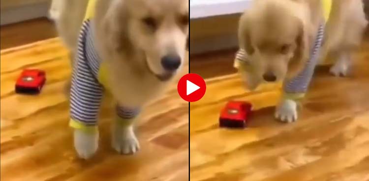 وائرل ویڈیو میں دیکھا جاسکتا ہے کہ ’کھلونا کار کتے کے پیر سے ٹکراتی ہے جس کے بعد وہ لنگڑا کر چلنے کی اداکاری کرتا ہے اور آگے جاکر مرنے کی ایکٹنگ بھی کرتا ہے۔