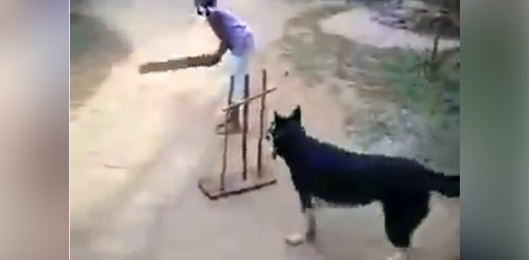 ویڈیو میں دیکھا جاسکتا ہے کہ کتا بچوں کی مدد کررہا ہے اور وہ بیک وقت وکٹ کیپر ، فیلڈر کا کام انجام دے رہا ہے۔