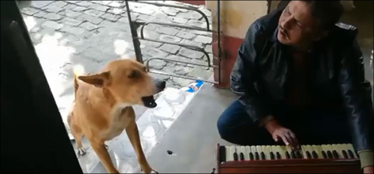 ویڈیو میں دیکھا جاسکتا ہے کہ جب ہارمونیم بجانے والا شخص آلاب لے رہا ہے تو کتا بھی اُس کے ساتھ یہی کوشش کررہا ہے۔