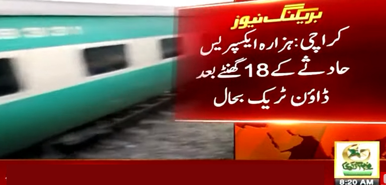 نواب شاہ میں گزشتہ روز ہزارہ ایکسپریس کو پیش آنے والے سنگین حادثے کے 18 گھنٹے بعد ڈاؤن ٹریک مرمت کرکے ٹرین آپریشن بحال کر دیا گیا ہے۔