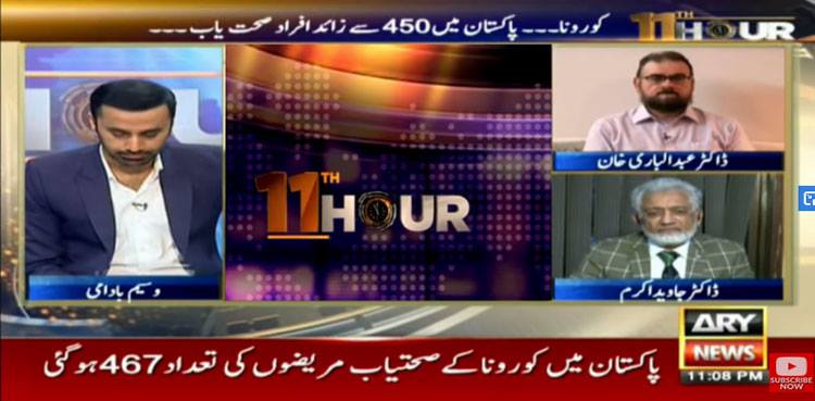 تفصیلات کے مطابق اے آر وائی نیوز کے پروگرام الیونتھ آور میں گفتگو کرتے ہوئے ڈاکٹرعبدالباری خان نے کہا کہ پاکستان میں کوروناوائرس کی ابھی پیک نہیں آئی ہے، پاکستان میں کوروناوائرس کے مریضوں کی تعداد بڑھے گی۔