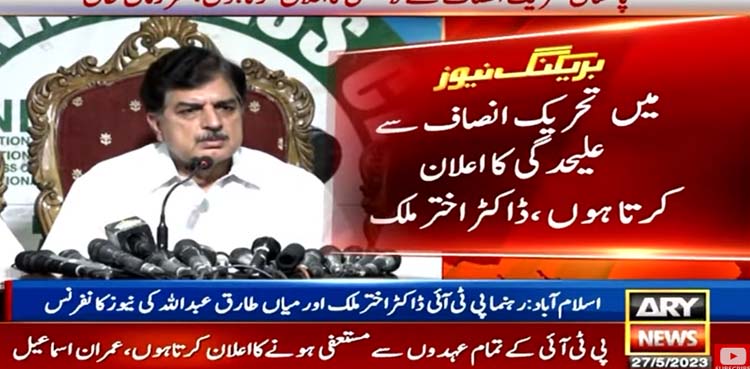 اے آر وائی نیوز کے مطابق پی ٹی آئی رہنما اور سابق صوبائی وزیر پنجاب ڈاکٹر اختر ملک نے کہا کہ میں تحریک انصاف سے علیحدگی کا اعلان کرتا ہوں ساتھ ہی سیاست چھوڑنے کا بھی اعلان کرتا ہوں۔
