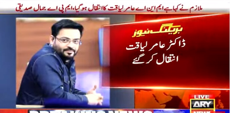تفصیلات کے مطابق رکن قومی اسمبلی عامر لیاقت حسین انتقال کر گئے ، ایم پی اے پی ٹی آئی جمال صدیقی نے تٖصدیق کی کہ ملازم نے کہا ہے ایم این اے عامر لیاقت کا انتقال ہوگیا ہے۔