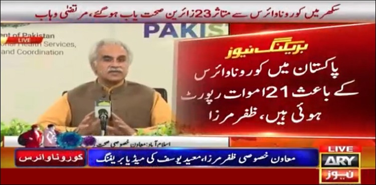 اسلام آباد: معاون خصوصی برائے صحت ڈاکٹر ظفر مرزا کا کہنا ہے کہ ملک میں کرونا وائرس سے 21 افراد انتقال کرگئے۔