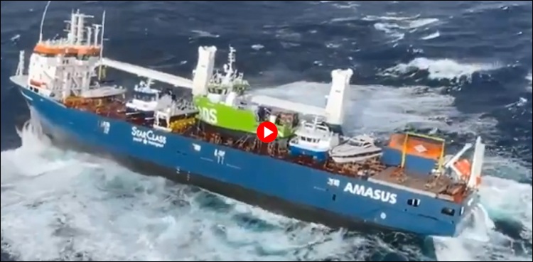 برطانوی نشریاتی ادارے دی سن نے ناروے کے سمندر میں پھنسنے والے مال بردارجہاز کی ویڈیو انٹرنیٹ پر شیئر کی جس میں جہاز کو لہروں کے سامنے بے بس اور پانی میں ہچکولے کھاتے دیکھا جاسکتا ہے۔