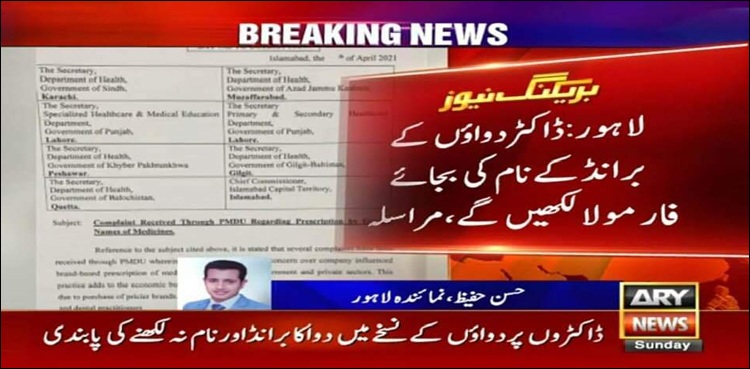 اے آر وائی نیوز کی رپورٹ کے مطابق ڈریپ کی جانب سے ڈاکٹرز کو مراسلہ ارسال کیا گیا جس میں انہیں ہدایت کی گئی ہے کہ وہ کسی بھی مریض کو نسخے میں دوائی کا نام اور برانڈ لکھ کر نہ دیں۔
