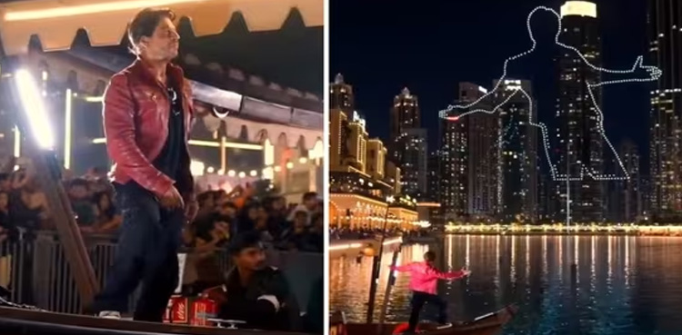 شاہ رخ خان نے دبئی کے آسمان میں ڈرونز کےبنائے گئے اپنے پوز اور نام کا خود بھی کافی انہماک سے مشاہدہ کیا۔ وہ کالی ٹی شرٹ اور سرخ جیکٹ میں ملبوس تھے۔