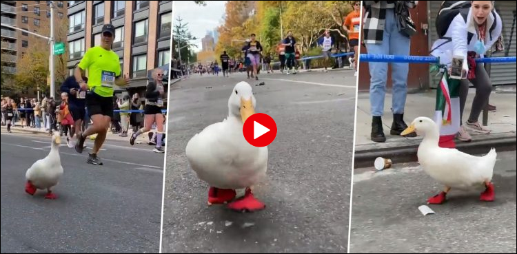 ویڈیو میں دیکھا جاسکتا ہے کہ ایک چھوٹی سی ’رنکل‘ نامی بطخ نیویارک میراتھن ریس میں ایتھلیٹس کے ساتھ دوڑ لگاتی ہوئی نظر آرہی ہے۔
