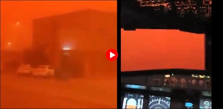 ریت کے طوفان کی وجہ سے آسمان سرخ ہوا جبکہ ہر طرف اندھیرا چھا گیا تھا جس کی وجہ سے حد نگاہ صفر ہوگئی تھی۔