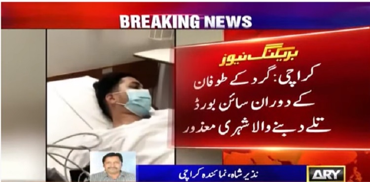 تفصیلات کے مطابق دو روز قبل کراچی میں اچانک گرد کے طوفان اور طوفانی ہوا کا سلسلہ شروع ہوا، جس کے نتیجے میں پورے شہر نے مٹی کی چادر اوڑھ لی تھی، ایسی صورت حال میں حادثات بھی رونما ہوئے، ایسا ہی ایک حادثہ سید اشعر شاہ نامی شہری کے ساتھ پیش آیا، جس کے باعث وہ زندگی بھر کے لئے معذور ہوگیا ہے۔
