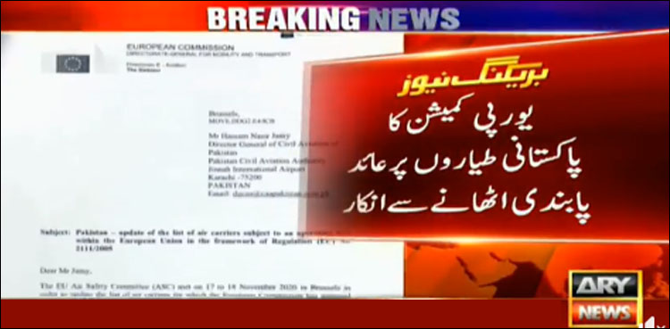 اے آر وائی نیوز کی رپورٹ کے مطابق یورپی کمیشن نے پی آئی اے سمیت پاکستانی طیاروں کی پروازوں پر پابندی اٹھانے سے انکار کردیا۔