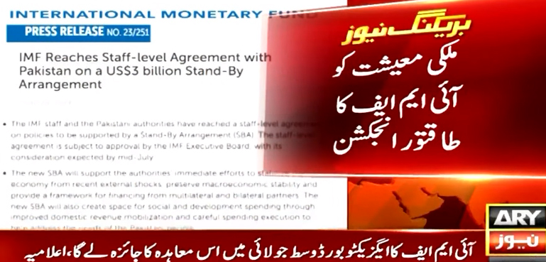 اے آر وائی نیوز کے مطابق پاکستان اور آئی ایم ایف کے درمیان اسٹاف لیول معاہدہ ہوگیا ہے معاہدے کی مالیت 3 ارب ڈالر ہے اور آئی ایم ایف کی جاب سے اس معاہدے کی تصدیق کر دی گئی ہے۔ اس حوالے سے معاشی ماہرین نے اے آر وائی نیوز سے گفتگو کرتے ہوئے اپنی رائے کا اظہار کیا اور کہا کہ اس معاہدے سے ڈیفالٹ کا خطرہ تو ٹل گیا لیکن آئی ایم ایف پروگرام آسان نہیں ہوگا۔