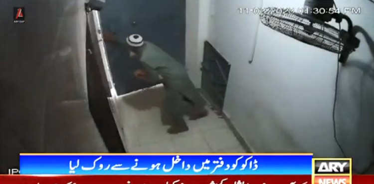 جس پر بزرگ ملازم نے بہادری کا مظاہرہ کرتے ہوئے ڈکیتی کی کوشش ناکام بنادی، ملازم کی مزاحمت پر ڈاکو دفترمیں داخل نہ ہوسکے۔