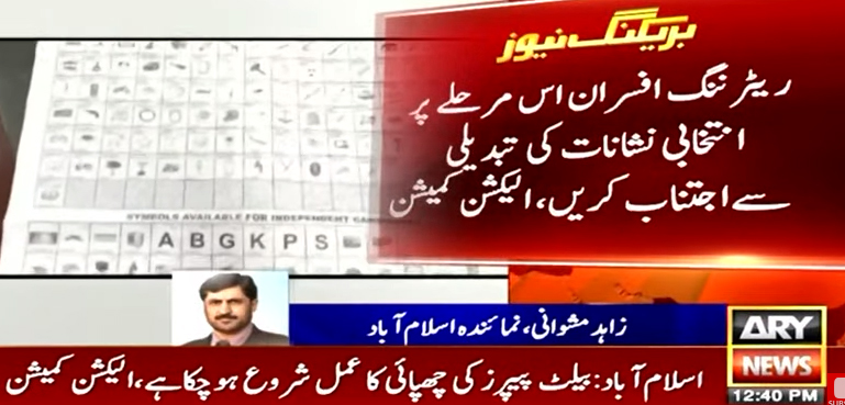 الیکشن کمیشن نے ریٹرننگ افسران کو کہا ہے کہ بیلٹ پیپرز کی چھپائی کا عمل شروع ہو چکا ہے۔ ہو سکتا ہے اس مرحلے پر انتخابی نشان کی تبدیلی ممکن نہ ہو سکے، اس لیے ڈی آر اوز اور آر اوز انتخابی نشانات کی تبدیلی سے اجتناب کریں۔