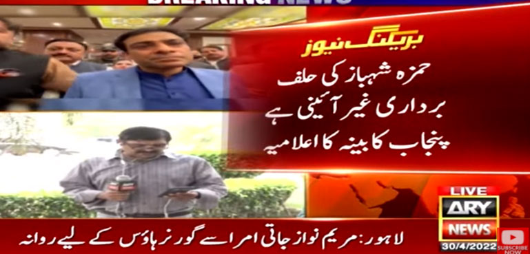 پنجاب کابینہ نے گورنر ہاؤس پر پولیس کی چڑھائی کی مذمت کرتے ہوئے حمزہ شہباز کا الیکشن اور حلف برداری کو غیر آئینی قرار دیا ہے۔