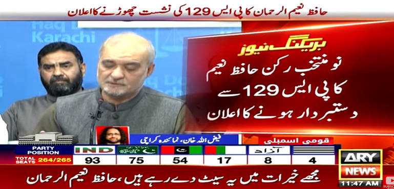 اے آر وائی نیوز کے مطابق امیر جماعت اسلامی کراچی اور نو منتخب رکن سندھ اسمبلی حافظ نعیم الرحمان نے کراچی میں پریس کانفرنس کرتے ہوئے پی ایس 129 کی اپنی جیتی ہوئی نشست چھوڑنے کا اعلان کرتے ہوئے کہا ہے کہ مجھے خیرات میں یہ سیٹ دے رہے ہیں۔ اس حلقے سے مجھ سے زیادہ ووٹ پی ٹی آئی کے حمایت یافتہ آزاد امیدوار سیف کو ملے اور میں اتنا ظرف رکھتا ہوں کہ اس سیٹ کو نہیں رکھوں گا اسی لیے پی ایس 129 کی سیٹ واپس کرتا ہوں۔