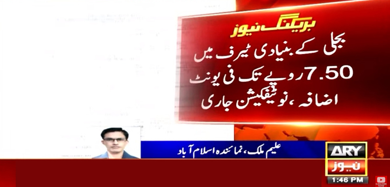 اے آر وائی نیوز کے مطابق حکومت نے بجلی کے بنیادی ٹیرف میں ساڑھے سات روپے فی یونٹ تک اضافے کا نوٹفیکشن جاری کر دیا ہے جس کا اطلاق جولائی 2023 سے ہوگا اس اضافے کے بعد بجلی کا فی یونٹ بنیادی 42 روپے 72 پیسے تک پہنچ گیا ہے جب کہ سیلز ٹیکس کے بعد فی یونٹ بنیادی ٹیرف 50 روپے 41 پیسے تک ہوگیا ہے۔