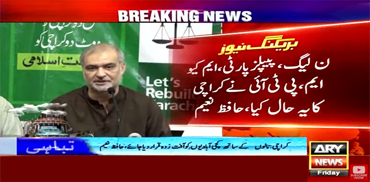 امیر جماعت اسلامی حافظ نعیم الرحمان نے مطالبہ کیا ہے کہ کراچی میں ہنگامی حالت نافذ کی جائے نالوں کے اطراف ایمرجنسی نافذ کی جائے۔