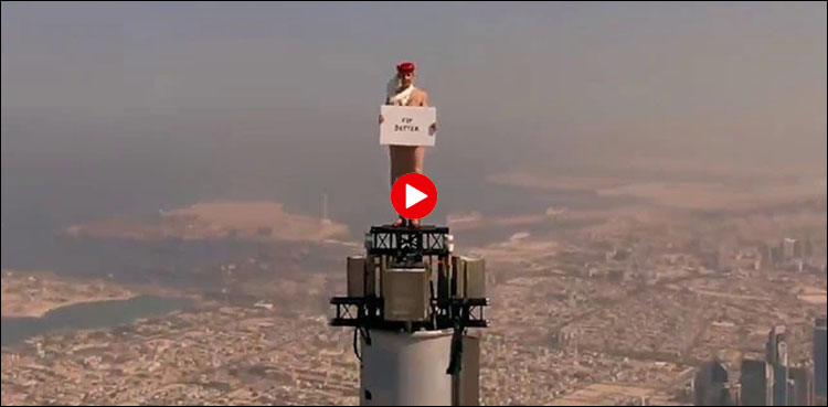 دبئی: متحدہ عرب امارات کی ایئرلائن ایمریٹس نے دنیا کی بلند ترین عمارت برج خلیفہ کی چوٹی پر اشتہار کی عکس بندی کی جس کی ویڈیو سوشل میڈیا پر وائرل ہوگئی۔
