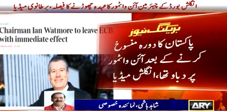 برطانوی میڈیا کے مطابق انگلش کرکٹ ٹیم کا دورہ پاکستان منسوخ کرنے کے بعد آئن واٹمور پر دباؤ تھا، برطانوی وزیراعظم بھی دورہ کینسل ہونے پر ناراض تھے تاہم اب چیئرمین ای سی بی نے عہدہ چھوڑ دیا ہے۔