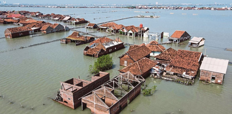 انڈونیشیا کے علاقے ٹمبلسلوکو کے ساحلی گاؤں جاون میں بڑھتی ہوئی لہروں نے اچھی خاصی زمین نگل لی ہے، جس نے وہاں کے رہائشیوں کو ایک نیا طرزِ زندگی اپنانے پر مجبور کردیا ہے۔