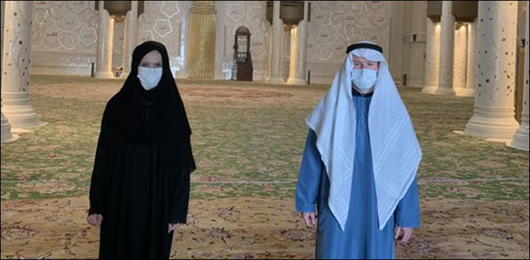 مسجد کے دورے کے موقع پر مورگن کی اہلیہ نے بھی روایتی اماراتی لباس زیب تن کیا ہوا ہے۔