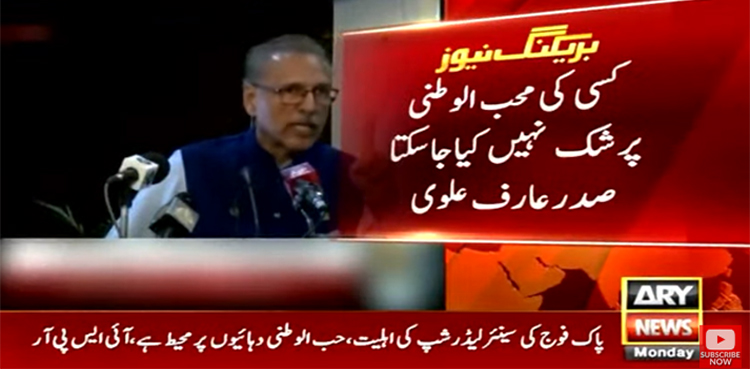 صدر مملکت ڈاکٹر عارف علوی نے کہا ہے کہ فوج کا ہر بندہ محب وطن ہے کسی کی حب الوطنی پر شک نہیں کیا جاسکتا۔