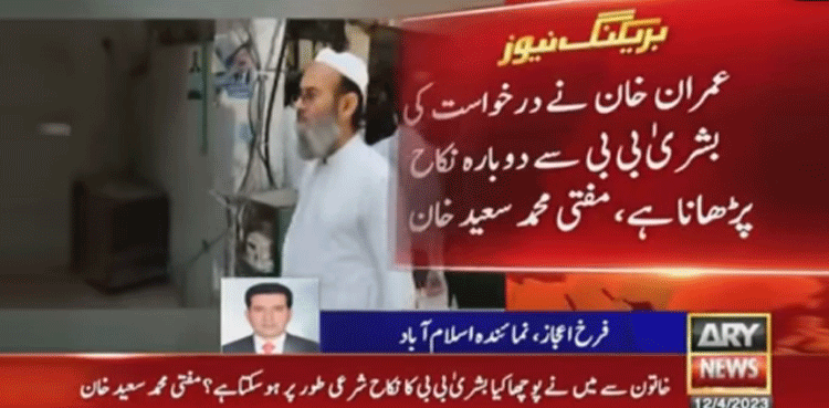 مفتی نے کہا کہ بشریٰ بی بی کے ساتھ ایک خاتون نے خود کو بشریٰ بی بی کی بہن ظاہر کیا، خاتون سے میں نے پوچھاکیا بشریٰ بی بی کا نکاح شرعی طور پر ہوسکتا ہے؟ جس پر خاتون نے بتایابشریٰ بی بی کے نکاح کی تمام شرعی شرائط مکمل ہیں، عمران خان اور بشریٰ بی بی کا نکاح پڑھایا جاسکتا ہے۔