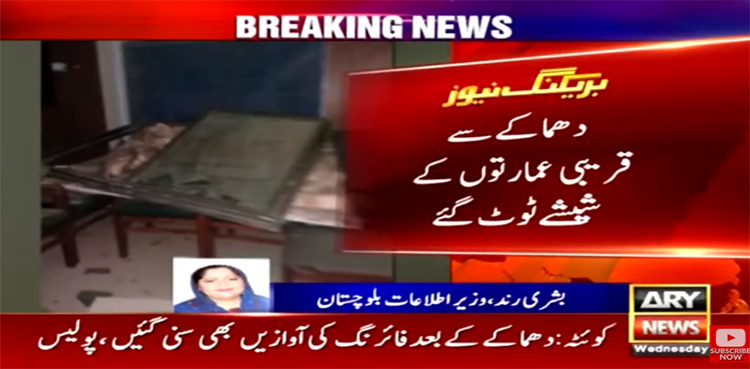 بشریٰ رند نے کہا کہ نوشکی بازار مینگل روڈ پر واقع ایف سی ہیڈکوارٹر کے گیٹ نمبر 2 کے باہر زوردار دھماکا ہوا جس کے نتیجے میں اطراف کی سرکاری عمارتوں کے شیشے ٹوٹ گئے اور سول اسپتال کو بھی نقصان پہنچا۔