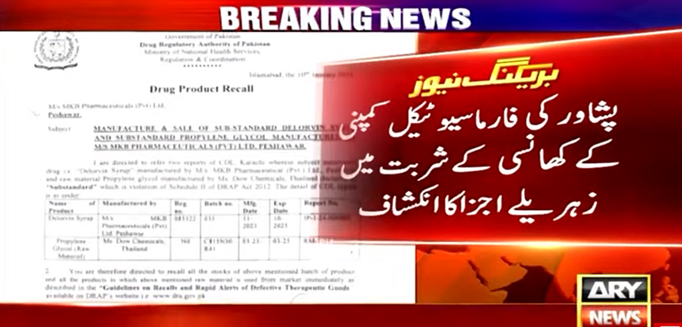 ڈرگ ریگولیٹری اتھارٹی (ڈریپ) کے مطابق پشاور کی فارماسیوٹیکل کمپنی کے کھانسی کے شربت (بیچ نمبر C815N30R41( میں زہریلے اجزا کا انکشاف ہوا ہے جس کے بعد ڈریپ نے ایم کے بی نامی کمپنی کے تمام کھانسی کے شربت واپس منگوا لیے ہیں۔
