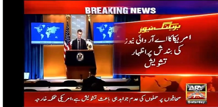 واشنگٹن (رپورٹ: جہانزیب علی): اے آر وائی نیوز کی بندش کی گونج امریکا تک جا پہنچی، امریکی محکمہ خارجہ نے چینل کی بندش پر تشویش کا اظہار کردیا۔