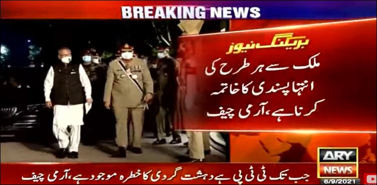 تفصیلات کے مطابق جی ایچ کیو راولپنڈی میں یوم دفاع وشہدا کی مرکزی تقریب کے اختتام پر غیر رسمی گفتگو کرتے ہوئے آرمی چیف نے کہا کہ ملک سے ہرطرح کی انتہا پسندی کاخاتمہ کرنا ہے، جب تک ٹی ٹی پی ہے دہشت گردی کاخطرہ موجود ہے۔