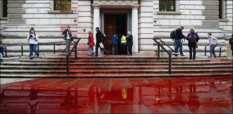 لندن میں واقع برطانیہ کی سرکاری عمارت کے باہر ایکسٹینشن ریبیلین نامی تنظیم کے کارکنان نے فائر بریگیڈ کا استعمال کرتے ہوئے سرخ رنگ (مصنوعی خون) کی بارش کی۔