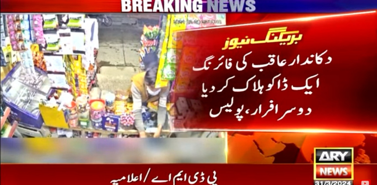 فوٹیج میں دو نقاب پوش ڈاکوؤں کو بزورِ اسلحہ دکان میں واردات کرتے دیکھا جاسکتا ہے، ڈاکو واردات کر کے جانے لگے تو عاقب نامی دکاندار نے اُن کے پیچھے جاکر فائرنگ کردی جس سے ایک ڈاکو ہلاک ہوگیا اور دوسرا ڈاکو موقع سے فرار ہوگیا۔