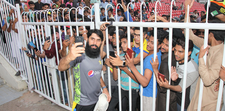 تفصیلات کے مطابق قومی کرکٹ ٹیم کے ہیڈ کوچ اور چیف سلیکٹر مصباح الحق نے قذافی اسٹیڈیم میں مداحوں سے ملاقات کی، مصباح نے سدرن پنجاب اور سینٹرل پنجاب کے میچ کے دوران مداحوں کے ساتھ تصاویر بنوائیں اور آٹوگراف دئیے۔