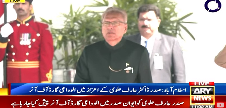 اے آر وائی نیوز کے مطابق الوداعی گارڈ آف آنر پیش کرنے کی پُر وقار تقریب ایوان صدر میں منعقد ہوئی جس میں مسلح افواج کے دستے نے صدر مملکت کو الوداعی گارڈ آف آنر پیش کیا۔