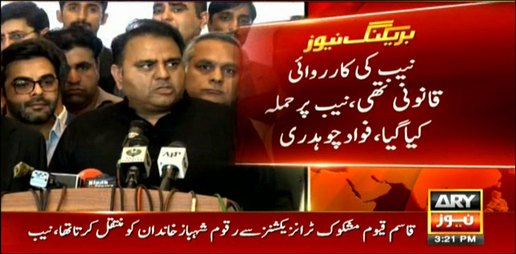 فوادچوہدری نے کہا نیب کی کارروائی کےجواب میں قانون کامذاق اڑایاگیا، احتساب کاعمل کسی کی دھمکیوں سےرکنے والا نہیں ہے۔