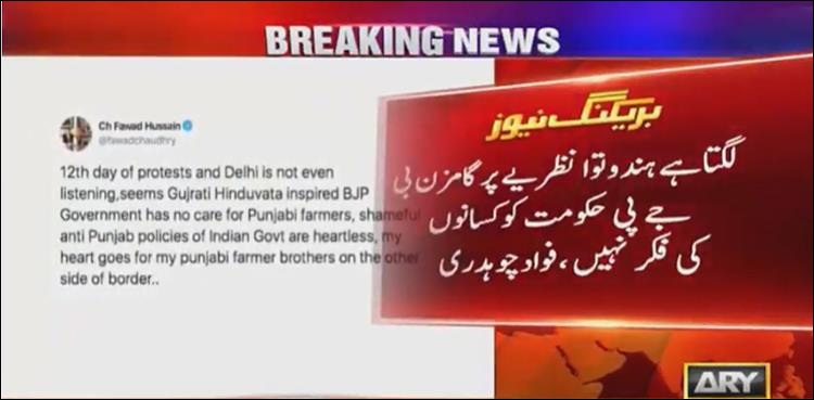 فواد چوہدری نے اپنے ٹؤئٹ میں کہا کہ لگتا ہے ہندوتوا نظریے پر گامزن بھارتیہ جنتا پارٹی کی حکومت کو کسانوں کی فکر نہیں، اسی لیے بھارتی حکومت کی پنجاب کے خلاف پالیسیاں شرمناک اور بے رحم ہیں۔