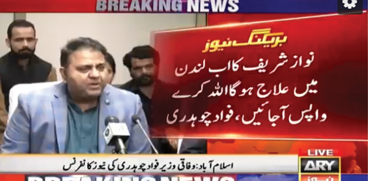 تفصیلات کے مطابق وزیرسائنس اینڈ ٹیکنالوجی فواد چوہدری نے تقریب سے خطاب کرتے ہوئے کہا میاں صاحب نےمجھےکیوں نکالاسےخداکےلیےمجھےنکالوکاسفربہت جلدکیا، لگ رہاہےنوازشریف صحت مندہیں، اب ان کا علان لندن میں ہوگا اللہ کرے واپس آجائیں۔