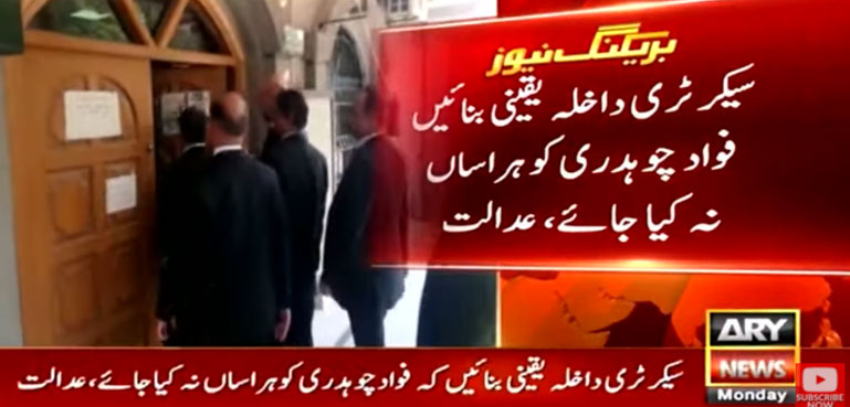 چیف جسٹس اسلام آباد ہائیکورٹ نے فواد چوہدری کی درخواست پر فریقین کو نوٹس جاری کرتے ہوئے کہا کہ سیکریٹری داخلہ یقینی بنائیں کہ فواد چوہدری کو ہراساں نہ کیا جائے، اس کے ساتھ ہی انہوں نے عدالتی احکامات کی نقل سیکریٹری قومی اسمبلی کو بھی بھجوانے کی ہدایت کی۔