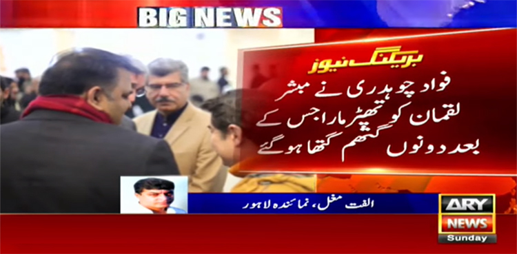 لاہور: وفاقی وزیر سائنس و ٹیکنالوجی فواد چوہدری نے بھری محفل میں نجی ٹی وی کے اینکر پرسن مبشر لقمان کو تھپڑ رسید کر دیا۔